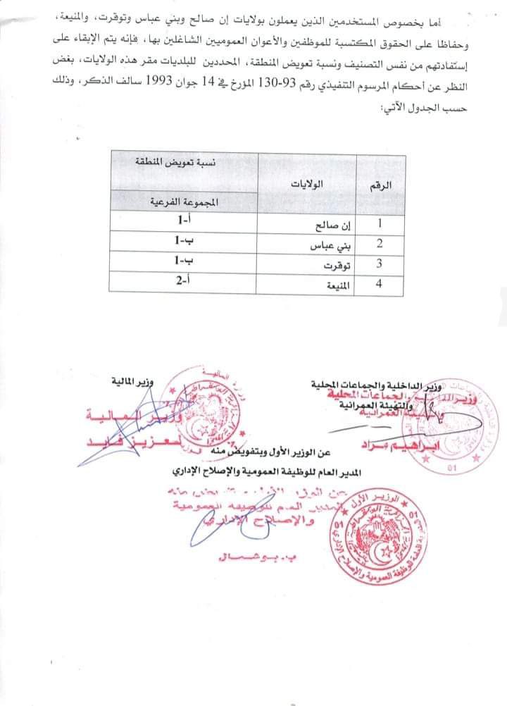 2. مرسوم تنفيذي 93-130 مؤرخ في 14 جوان 1993، يتضمن ضبط قائمة المناطق التي تخول الحق في تعويض المنطقة المنصوص عليه في المرسوم رقم 82-183 المؤرخ في 15 ماي 1982 والمتعلق بكيفيات حساب تعويض المنطقة.